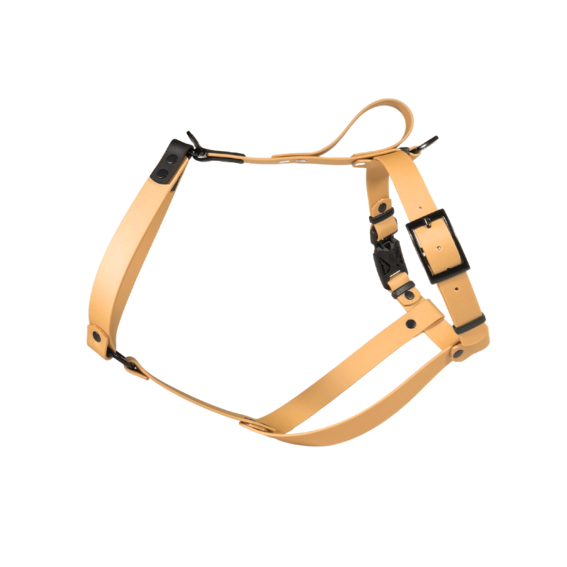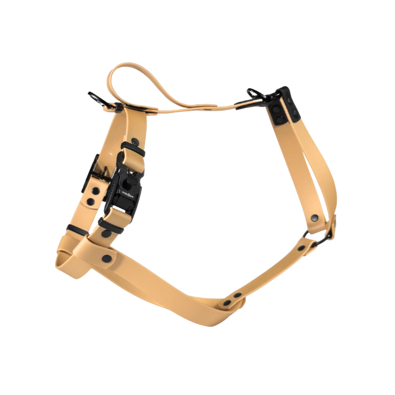 Szelki zostały wykonane z oryginalnej taśmy BioThane®, która łączy w sobie trwałość tworzyw sztucznych z elegancją skóry. Odporna na warunki atmosferyczne, błoto i wodę, nie nasiąka zapachami i jest łatwa w czyszczeniu – wystarczy wilgotna ściereczka.
